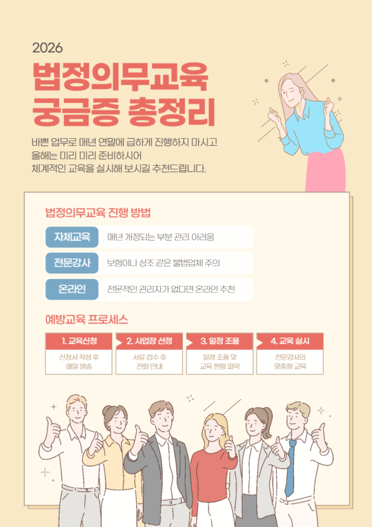 법정의무교육의 경우 자체교육, 전문강사 초빙, 온라인 위탁 교육 중 본인의 사업장에 가장 적합한 방법으로 진행을 하시면 되는데요.
